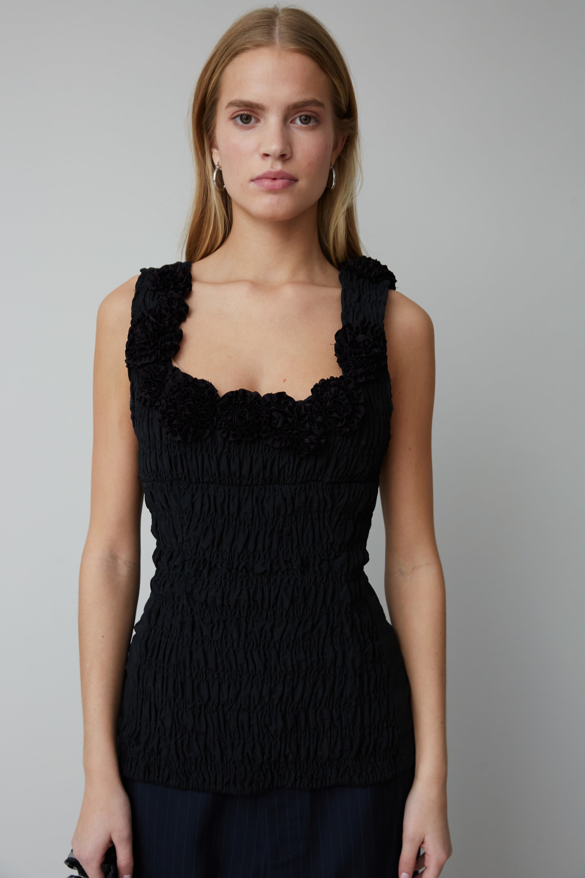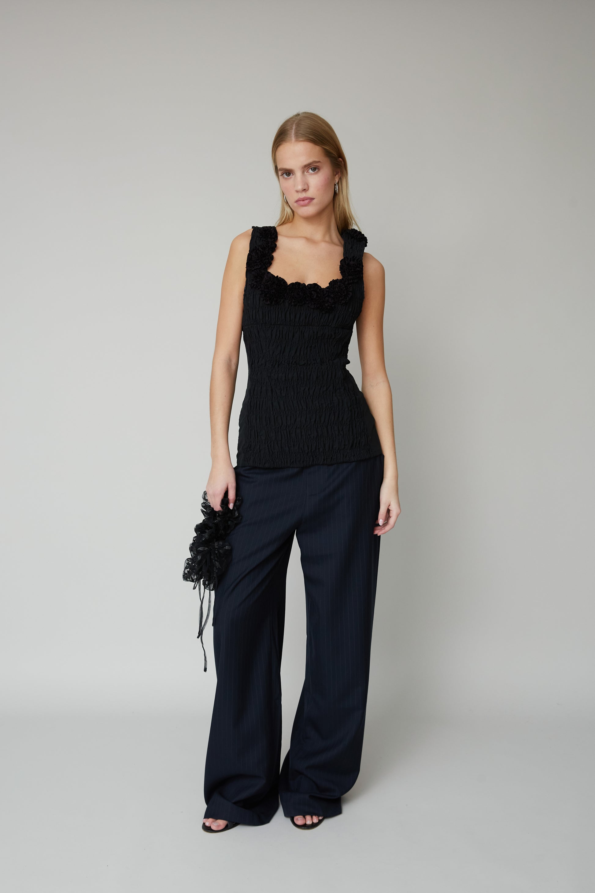 The Elsa Top has a fitted silhouette and a textured, ruched fabric throughout. It features a flattering scoop neckline adorned with fabric rosettes, adding a romantic and feminine touch. The shoulder straps are wide and also embellished with matching rosettes.