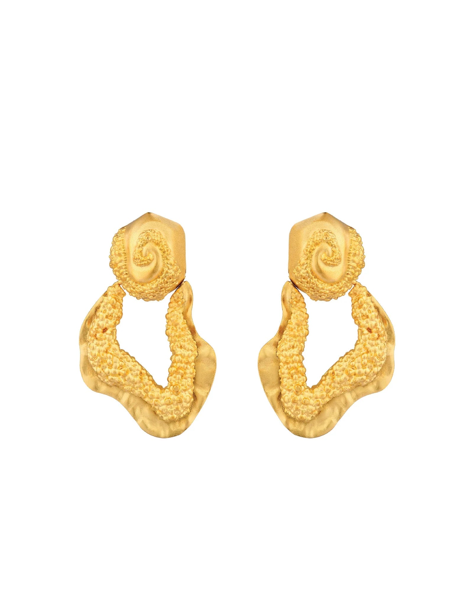 The Hera Earrings embody feminine energy through their distinctive irregular hoop design, suspended from a bold domed stud. Featuring a granulated inner layer that symbolizes dynamic, charged energy, these earrings contrast beautifully with smooth polished surfaces—reflecting the dual nature of women as both strong and graceful. Expertly crafted, the E-Hera-Gold offers a sophisticated statement piece that balances artistry with meaningful symbolism.