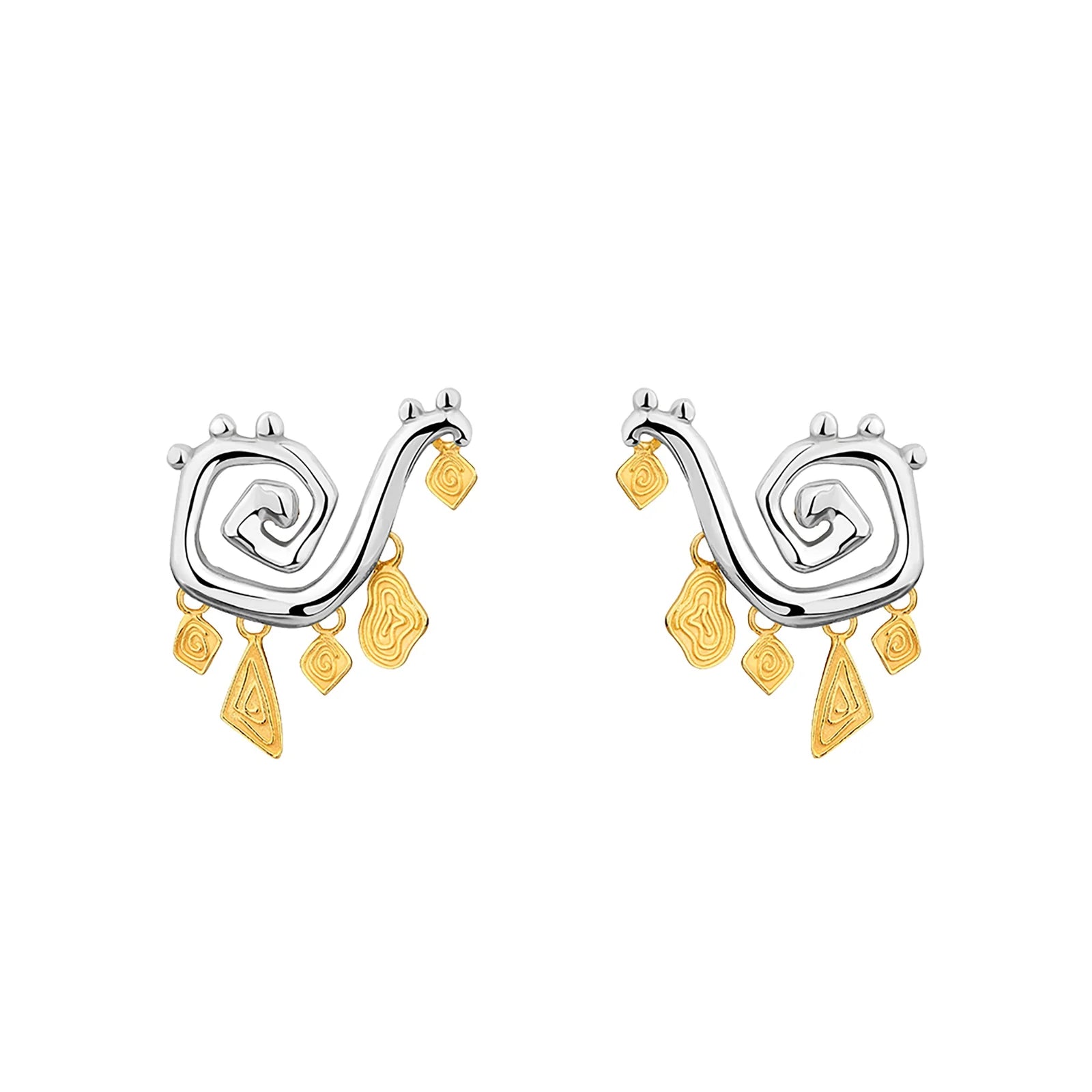 The Hera Earrings embody feminine energy through their distinctive irregular hoop design, suspended from a bold domed stud. Featuring a granulated inner layer that symbolizes dynamic, charged energy, these earrings contrast beautifully with smooth polished surfaces—reflecting the dual nature of women as both strong and graceful. Expertly crafted, the E-Hera-Gold offers a sophisticated statement piece that balances artistry with meaningful symbolism.