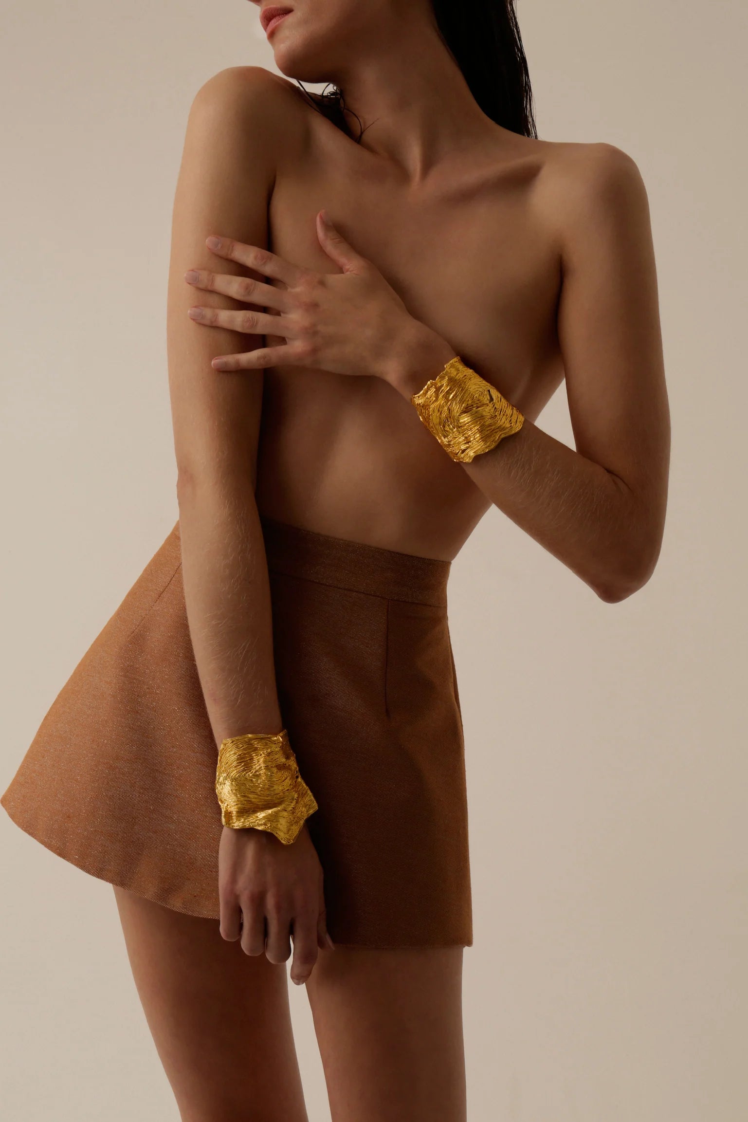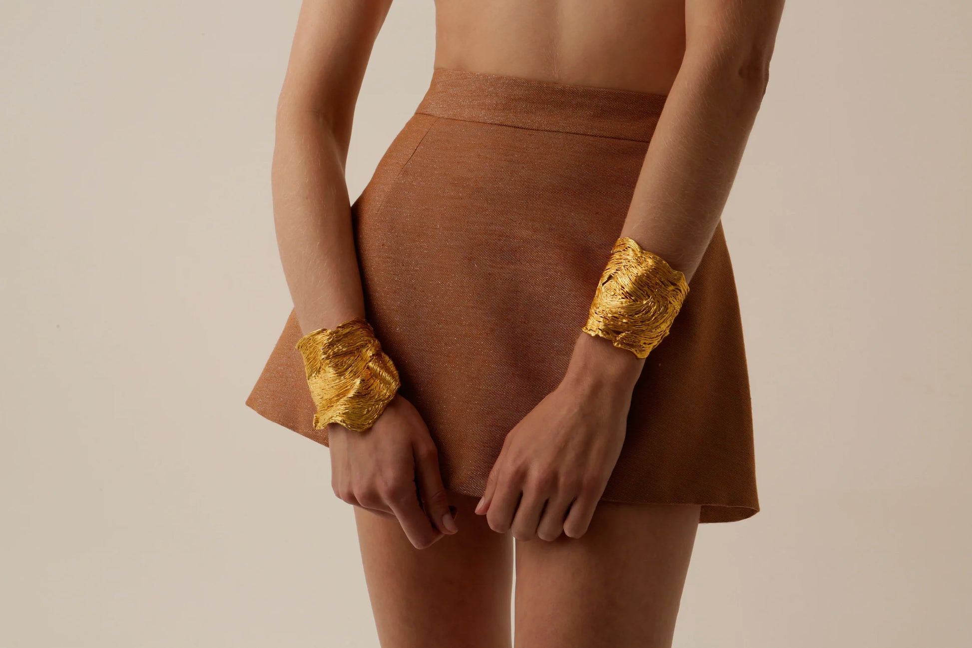 The Pip Cuff is expertly crafted in New York using Jacqueline Barbosa’s proprietary technique, ensuring exceptional quality and unique design. Available in 18k yellow gold plated brass and white rhodium plated brass, this piece offers both durability and a refined finish. Its distinctive style adds a sophisticated, artisanal touch to any collection.